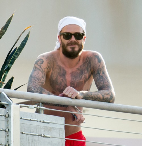 David Beckham shows off his buff body and bushy beard while he soaks up the sun with his buddy Dave Gardner in Miami. Becks is in town to work on his MLS soccer team plans but took time off to relax at his hotel with a t-shirt wrapped around his head.