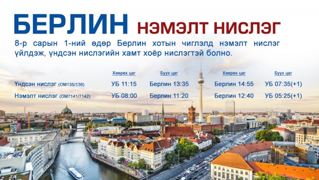 Ингэснээр тус өдөр Берлиний чиглэлд 2 нислэгтэй болж байгаа бөгөөд үндсэн нислэгээс гадна 162 хүний суудал бүхий Б737-800 агаарын хөлгөөр нэмэлт нислэг үйлдэнэ.