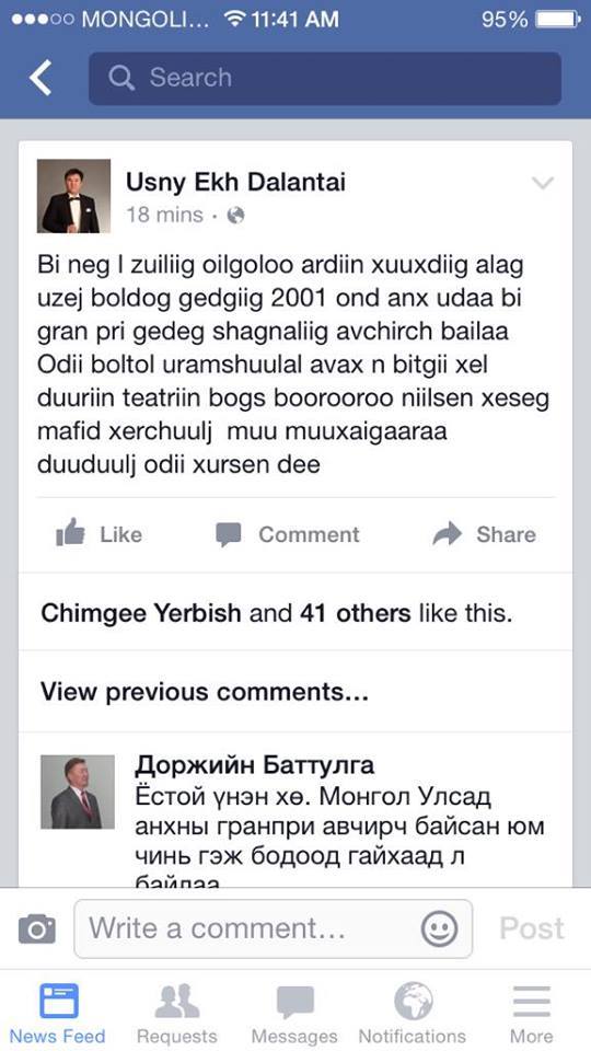Дэлхийн нэрт хөгжмийн зохиолч П.И.Чайковскийн нэрэмжит уралдаанд хэдхэн хоногийн өмнө МУГЖ Г.Ариунбаатар түрүүлсэн баяртай мэдээг дуулгасан билээ. Түүнийг дэлхийн хэмжээнд Монголын нэрийг гаргасан хэмээн Засгийн газраас түүнийг 80 сая төгрөгөөр шагнах саналыг УИХ-ын гишүүн Л.Гантөмөр санаачлан батлуулсан юм. Энэ дагуу дуучин Г.Ариунбаатар өнөөдөр шагналаа гардаж авсан ажээ. Харин энэ тухай МУГЖ дуучин У.Далантай ийнхүү бухимдаж өөрийн цахим хуудаснаа “Би нэг л зүйлийг ойлголоо ардын хүүхдийг алаг үзэж болдог гэдгийг. 2001 онд анх удаа би гран при гэдэг шагналыг авчирч байлаа. Өдий болтол урамшуулал авах нь битгий хэл дуурийн театрын бөгс бөөрөөрөө нийлсэн хэдэн мафид хэрчүүлж муу муухайгаараа дуудуулж өдий хүрсэн дээ” хэмээн нийтэлжээ. Гавьяатыг нөхөөд шагнах ёстой мэт. Учир нь уран бүтээлч хүн гэдэг урмаар явдаг шүү дээ. Төр засгийн эрх мэдэлтнүүд ардын хүүхдийг алаг үзэх үзэлээ болих хэрэгтэй байна.