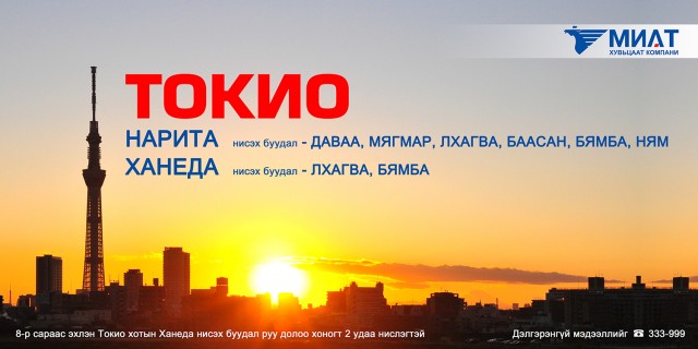 Үндэсний агаарын тээвэрлэгч “МИАТ” ТӨХК Япон улсын нийслэл Токио хотын Ханеда олон улсын нисэх буудал руу 8-р сарын 5-ны өдрөөс эхлэн нислэг үйлдэж эхэлнэ.