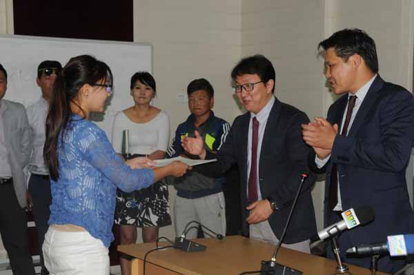 DSC_4097Монгол Улсын Боловсрол, соёл, шинжлэх ухааны яам Бүгд Найрамдах Хятад Ард Улсын Боловсролын яам хоорондын Монгол Хятадын тусгай хөтөлбөр хэрэгжүүлэх тухай санамж бичгийн дагуу 2015-2016 оны хичээлийн жилээс бакалавр, магистр, докторын сургалтад суралцах оюутнуудад тэтгэлгийн урилгыг өнөөдөр гардуулж өглөө.