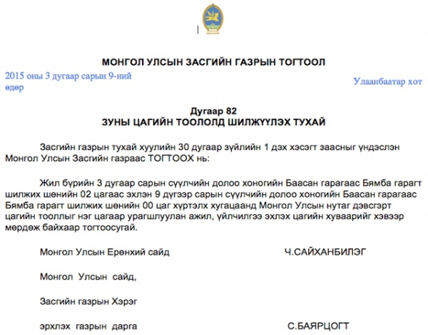 2015 оны 3 дугаар сарын 09-ний өдрийн Засгын газрын 14-р ээлжит хуралдаанаар Монгол улсад зуны цагийн хуваарьт шилжих тухай хэлэлцэж баталсан. Энэ тогтоолд жил бүрийн 3 дугаар сарын сүүлчийн долоо хоногийн Баасан гарагаас Бямба гарагт шилжих шөнийн 02 цагаас эхлэн 9 дүгээр сарын сүүлчийн долоо хоногийн Баасан гарагаас Бямба гарагт шилжих шөнийн 00 цаг хүртэлх хугацаанд Монгол Улсын нутаг дэвсгэрт цагийн тооллыг нэг цагаар урагшлуулан ажил, үйлчилгээ эхлэх цагийн хуваарийг хэвээр мөрдөж байхаар тогтоосон.