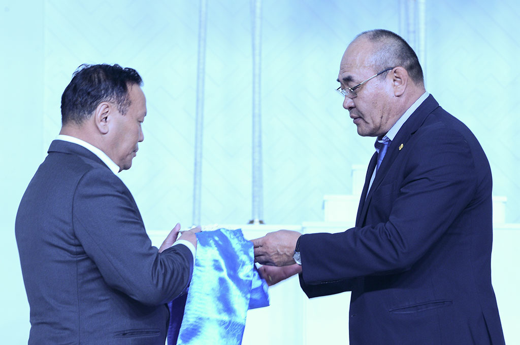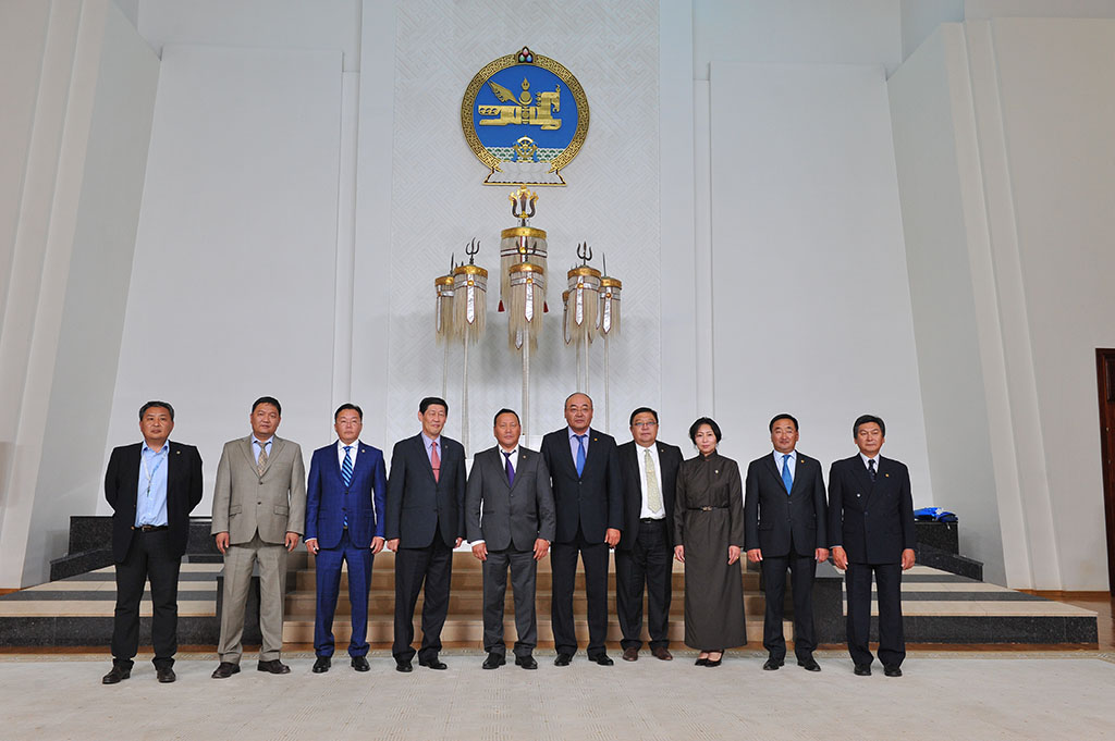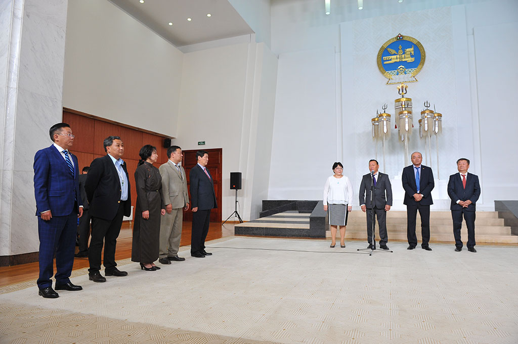 УИХ-ын ээлжит бус чуулганы хуралдаанаар томилогдсон Монгол Улсын Засгийн газрын гишүүн-Монгол Улсын Шадар сайд Цэрэндашийн Оюунбаатар, Монгол Улсын Засгийн газрын гишүүн-Сангийн сайд Баярбаатарын Болор, Монгол Улсын Засгийн газрын гишүүн-Байгаль орчин, ногоон хөгжил, аялал жуулчлалын сайд Намдагийн Батцэрэг, Монгол Улсын Засгийн газрын гишүүн-Барилга, хот байгуулалтын сайд Зангадын Баянсэлэнгэ, Монгол Улсын Засгийн газрын гишүүн-Зам тээврийн сайд Мөнхчулууны Зоригт, Монгол Улсын Засгийн газрын гишүүн-Хөдөлмөрийн сайд Гарьдхүүгийн Баярсайхан нарт Монгол Улсын Гадаад хэргийн сайд Л.Пүрэвсүрэн, Аж үйлдвэрийн сайд Д.Эрдэнэбат, Уул уурхайн сайд Р.Жигжид, Хүн амын хөгжил, нийгмийн хамгааллын сайд С.Эрдэнэ, ЗГХЭГ-ын Тэргүүн дэд дарга Ш.Солонго, ЗГХЭГ-ын дэд дарга Г.Ганболд нар тамгыг нь гардуулан өгч, ажлын амжилт хүслээ.
