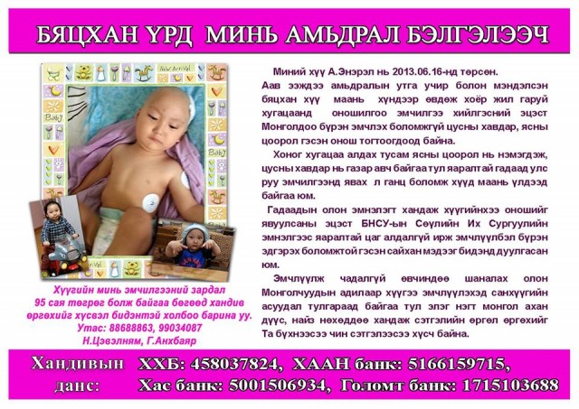 Энэ бяцхан хүүгийн эмчилгээний зардал хүрэлцэхгүй байна. Сайхан сэтгэлт ард түмэн минь яаралтай тусалж, олны хүчээр нэг ч гэсэн Монгол хүүгээ эмчлүүлж аварцгаая! Та бүхэн хайрын гараа сунгаарай! 2013 оны 6 дугаар сарын 16-нд аавын ээжийнхээ амьдралын утга учир болон мэндэлсэн А.Энэрэл хүү хүндээр өвдөж 2 жил гаруйн хугацаанд эмчилгээ хийлгэсэн боловч саяхан онош нь бүрэн тодорч Монголдоо эмчилгээ хийлгэх боломжгүй. Цусны хавдар, ясны цоорол гэсэн онош тогтоогдоод байгаа юм байна. Хугацаа алдах тусам өвчин нь улам хүндэрч байгаа тул гадны эмнэлэгүүдэд хандаж хүүгийн оношийг явуулахад БНСУ-ын Сөүлийн их сургуулийн эмнэлэгээс “яаралтай эмчлүүлбэл бүрэн эдгэрэх боломжтой” гэсэн хариу иржээ. Солонгос улсад эмчилгээ хийлгэх зардал нь нийт 95 сая төгрөг болох юм байна. Монголчууд бид эвтэй байхдаа хүчтэй гэдэг билээ. Тал шигээ уужим сэтгэлтэй, тэнгэр шигээ саруул ухаантай Монгол хүн бүрийг А.Энэрэл хүүд туслахыг уриалж байна. Туслахыг хүссэн хүн бүхэн зураг дээрх утсаар холбогдоно уу.