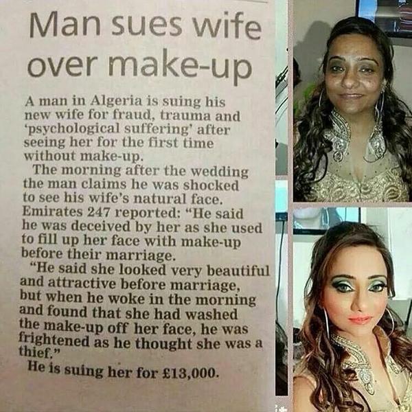 CPtI0L4UsAAbyCcАлжирын оршин суугч нэгэн эр шинээр гэрлэсэн эхнэрээ шүүхэд өгсөн байна. Тэрээр нүүр царайгаа оо энгэсгээр нуун далдалж хууран мэхэлсэн,  анх удаа будаггүй нүүрийг нь хараад шоконд орсон “сэтгэл санааны нөхөн төлбөр” хэмээн нэхэмжилсэн аж.