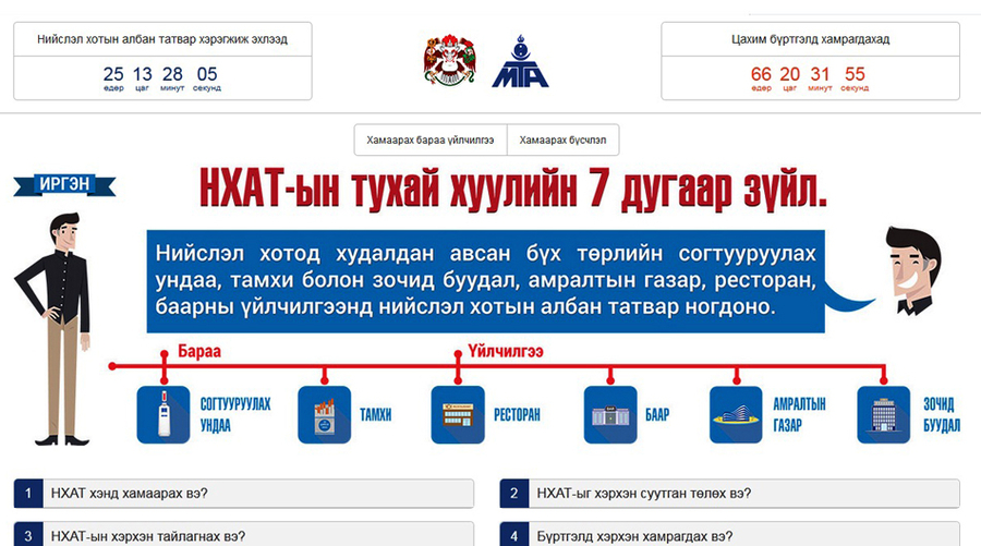 p1a2ha2bfo1akfudn1b5k1q5si171УИХ-аас баталсан Нийслэл хотын албан татварын тухай хууль энэ сарын 1-нээс эхлэн хэрэгжиж эхэлсэн. Бүх төрлийн согтууруулах ундаа, тамхины худалдан авалтаас болон баар ресторан, зоогийн газар, амралтын газрын үйлчилгээнээнд нийслэлийн хотын албан татварыг нэг хувиар тооцон ногдуулах бөгөөд хуулийн дагуу нийслэл хотын албан татварыг төсөвт төлөх эхний хугацаа 2015.11.10-ны өдрийн дотор юм. Тиймээс худалдаа үйлчилгээ эрхлэгч аж ахуйн нэгж, иргэдэд хотын албан татварын хуулийн талаарх дэлгэрэнгүй, ойлгомжтой мэдээллийг хүргэх зорилгоор  www.ubtax.mn цахим хуудсыг ашиглалтад орууллаа.  Энэхүү цахим хуудаснаас нийслэл хотын нутаг дэвсгэрт дээрх үйл ажиллагаа эрхлэгч аж ахуйн нэгж, байгууллагууд нь хууль эрх зүй, албан татвар ногдуулах бараа, үйлчилгээ, албан татвар хэрхэн ногдуулах, хэрхэн хамрагдах, тайлагнах гэх мэт дэлгэрэнгүй мэдээ, мэдээллийг маш ойлгомжтойгоор авах боломжтой юм. Дашрамд дуулгахад, худалдан авагчдад өгөх баримтан дээр  хотын албан татварын дүнг тусгах системийн хөгжүүлэлтийн ажил бүрэн дууссан бөгөөд кассын систем нийлүүлэгч 13 аж ахуй нэгжтэй хамтран ажиллах гэрээг байгуулан Нийсэл хотын албан татвар суутгагчя нарын кассын системд суурилуулах ажлыг хэрэгжүүлж байна гэж  Нийслэлийн ЗДТГ-ын Хэвлэл мэдээлэл, олон нийттэй харилцах хэлтсээс мэдээллээ.