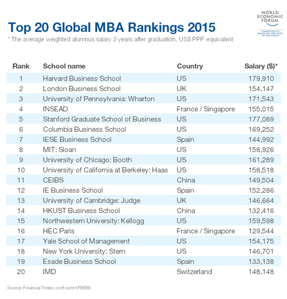 Хүйсийн харьцаа болон төгсөгчдийн цалингийн хэмжээ зэрэг үзүүлэлтүүд дээр суурилан хийсэн “Financial Times”-ын 2015 оны MBA ранкинг-аар дараах ТОП 20 бизнесийн сургууль тодорчээ.