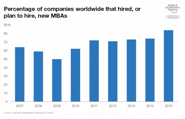 Сүүлийн үеийн судалгаагаар компаниудын 84% нь энэ жил MBA төгсөгчдийг ажилд авахаар хайж байгаа юм. Санхүүгийн хямралын үед энэ хэмжээ 62%-тай байсан байна. Доорх графикаас MBA төгсөгчдийг ажилд авсан, авахаар төлөвлөж байгаа компаниудын хувийг харж болно.