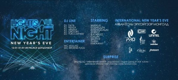 Энэ оны хамгийн сүүлчийн үдэш буюу 31-нийг хаана өнгөрүүлэхээ шийдэж амжаагүй байгаа юм биш биз. Найз нөхөд, хамт олноороо, хайртай дотны бүхэнтэйгээ Олон улсын шинэ жилийн үдэшлэгт очих гайхалтай боломж бидэнд байна. Монголд анхлан зохион байгуулагдаж байгаа энэхүү гэрэл, хөгжмийн хослосон FESTIVAL нь хамгийн олон гэрлийн үзүүлбэртэй бөгөөд 2009 оноос хойш одоог хүртэл Дэлхийн бусад өндөр хөгжилтэй орнуудад албан ёсны эрхтэйгээр, сүр дуулиантайгаар, амжилттай зохион байгуулагдсаар иржээ. UB PALACE цогцолборт болох энэ оны хамгийн сүүлчийн, хамгийн шилдэг, хамгийн олон залуус болон гадаад, дотоодын хамгийн шилдэг уран бүтээлчид цуглах уг  FESTIVAL-д Их хотын залуус та бүхнийг урьж байна.
