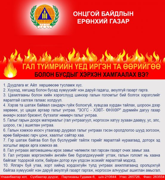 – Гэр орондоо зул, хүж асаахдаа галын аюулгүй байдлыг хангаж, хяналтгүй орхихгүй байх