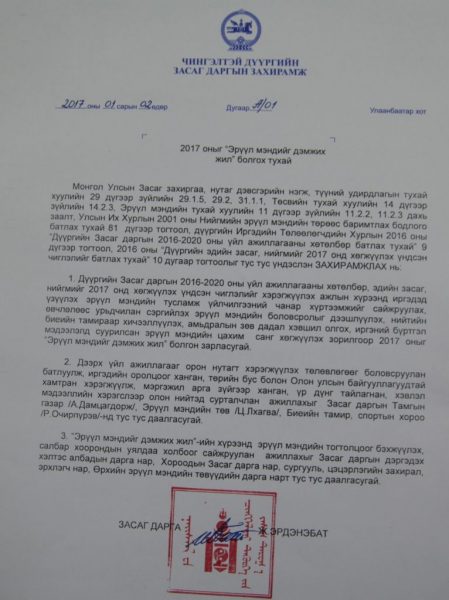 Орон нутагт хэрэгжүүлэх ажлын төлөвлөгөө боловсруулан батлуулж, иргэдийн оролцоог ханган, төрийн болон Олон улсын байгууллагуудтай хамтран эрүүл мэндийн тогтолцоог бэхжүүлэх, салбар хоорондын уялдаа холбоог сайжруулан ажиллахыг Засаг даргын Тамгын газар болон Засаг даргын дэргэдэх хэлтэс албадын дарга нар, хороодын Засаг дарга нар, сургууль, цэцэрлэгийн захирал, эрхлэгч нар, өрхийн эрүүл мэндийн төвүүдийн дарга нарт үүрэг болголоо.