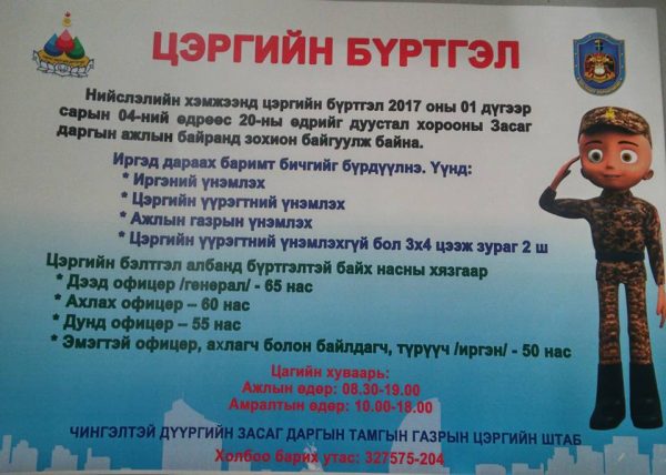 Нийслэлийн Засаг даргын А/853, дүүргийн Засаг даргын А/797 дугаар захирамжийн дагуу дүүргүүдийн хэмжээнд 2017 оны 01 дүгээр сарын 4-ний өдрөөс Цэргийн бүртгэл эхэллээ. Цэргийн бүртгэлд 60 хүртэлх насны бэлтгэл офицерууд, 18-50 насны эрчүүд, цэргийн анги, байгууллагад ажиллаж байгаа генерал, офицер, ахлагч нар, гэрээт цэргийн алба хаагч, цэрэгжсэн болон үндэсний аюулгүй байдлыг хангах тусгайлсан чиг үүрэг бүхий байгууллагын алба хаагчид хамрагдана. Бүртгэлд хамрагдагчид өөрийн оршин сууж буй хороондоо ажлын өдөр 08.30-19.00 цаг, амралтын өдөр 10.00-18.00 цагийн хооронд очиж бүртгэлээ хийлгээрэй.