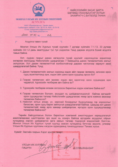 Улсын Их Хурлын гишүүн Д.Сумъяабазараас Хот, суурин газрыг дахин хөгжүүлэх тухай хуулийн хэрэгжилт, цаашид авч хэрэгжүүлэх арга хэмжээний талаар Нийслэлийн засаг дарга бөгөөд Улаанбаатар хотын захирагчид асуулга тавьжээ.