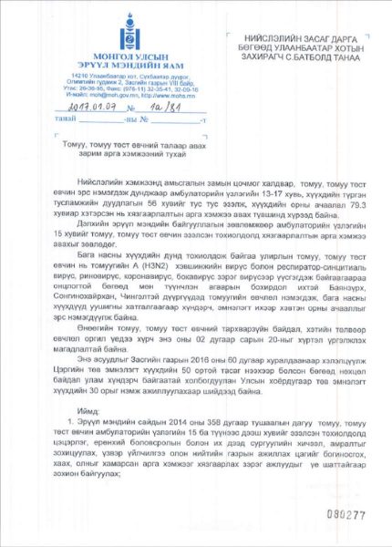 Нийслэлийн хэмжээнд амьсгалын замын цочмог халдвар, томуу, томуу төст өвчин эрс нэмэгдэж, амбулаторийн үзлэгийн 13-17 хувь, хүүхдийн түргэн тусламжийн дуудлагын 56 хувийг тус тус эзэлж, хүүхдийн орны ачаалал 79.3 хувиар хэтэрсэн нь хязгаарлалтын арга хэмжээ авах хэмжээнд хүрсэн байна. Үүнтэй холбогдуулан Эрүүл мэндийн сайд А.Цогцэцэг Нийслэлийн Засаг дарга бөгөөд Улаанбаатар хотын захирагч С.Батболдод албан тоот хүргүүллээ.