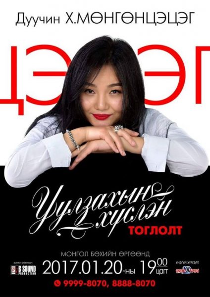 “Дуунд дуртай урлагт хайртай түмэндээ миний бие Мөнгөнцэцэг дуучин дүүгийнхээ “Уулзахын хүслэн” тоглолтыг үзэн сонирхож шүүн тунгаахыг санал болгоё. СУИС-ийн мэргэжлийн дуулаачын ангийг онц сайн дүүргэж төгссөн энэ эрхэм хөөрхөн дуучин дүүгээ онцолж, миний бие “Хайрийн дээд хань” дуугаа хамтран дуулсан нь учиртай. Энэ гайхамшигт увидасыг хэрхэн хөглөхөө би түүний тайзан дээр харуулнам зээ.Түүний хоолойн чадал цар хүрээг та бүхэн минь Монгол бүсгүйн гоо үзэсгэлэнтэй хослуулан тольдож хүлээн авж сонордоорой. Говь-Алтайгаас ургасан цуурай Монголоо чимэх болтугай” хэмээн халуун дулаан сэтгэлийн үгээ нийтлэжээ.