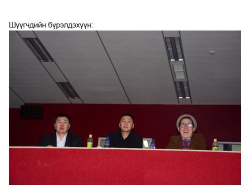 Урлагийн наадмын шүүгчээр Монгол Улсын Соёлын Тэргүүний Ажилтан, Хөгжим бүжгийн коллежийн дуулах урлагийн тэнхимийн эрхлэгч, доктор Д.Чинзориг, Монгол Улсын Соёлын Тэргүүний Ажилтан, жүжигчин М.Мөнхбаяр, Х-ТҮЦ хамтлагийн жүжигчин Баясгалан нар ажиллалаа.