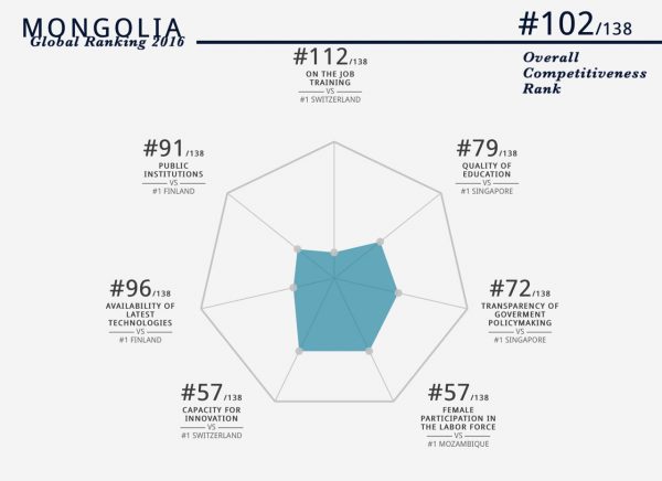 Дэлхийн Эдийн Засгийн Чуулганаас жил бүрийн нэгдүгээр сард дэлхийн улс орнуудын өрсөлдөх чадварын үзүүлэлтийг гаргадаг. Тус танилцуулгаас харахад манай улс 2016 оны байдлаар дэлхийн 138 орноос 102 дугаар байранд эрэмбэлэгдсэн байна. Харин 2015 онд Өмнөх жилийн хувьд 140 улс орноос 104 дүгээрт жагсаж байсан нь энэ жилийнхтэй харьцуулашгүй адилхан үзүүлэлт юм. Шалгаруулалтыг долоон үзүүлэлтээр гаргасан бөгөөд үзүүлэлт тус бүрээр Монгол улсын эзэлсэн байрыг үзүүлбэл: