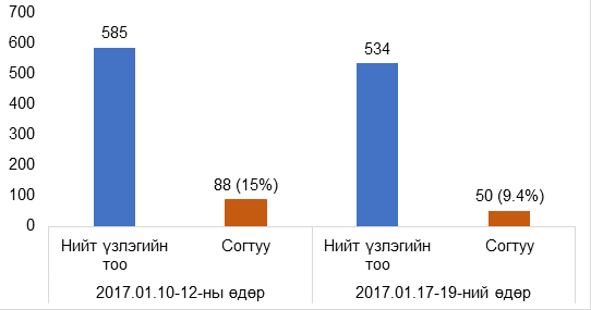 Өөрөөр хэлбэл өмнөх 7 хоногийн ЛХАГВА гарагаас БААСАН гараг хүртэлх хугацаанд ГССҮТөвд үйлчлүүлэгсдийн 15 хувь (88/585) нь согтууруулах ундаа хэрэглэсэн үйлчлүүлэгч байсан бол энэ 7 хоногийн лхагва гарагаас баасан гараг хүртэлх хугацаанд 9.4 хувь (50/534) нь согтууруулах ундаа хэрэглэсэн үйлчлүүлэгч байжээ.