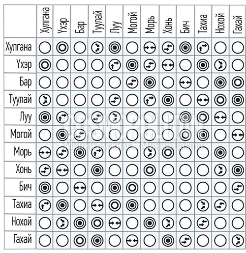 Далд зөрчилдөөн. Тодорхой хэмжээний түгшүүртэй харилцаа. Хосууд эвтэй найртай байхын тулд багагүй хүч зарцуулна. Тухайлбал, Хулгана жилтэнгүүдэд Хонь таалагддаггүй, Үхэр жилтэнгүүд Морьтой харьцахад бэрхшээлтэй, Бар жилтэнд Могой таалагдахгүй, Хулгана жилтэн Луутай харьцаж чадахгүй г.м.