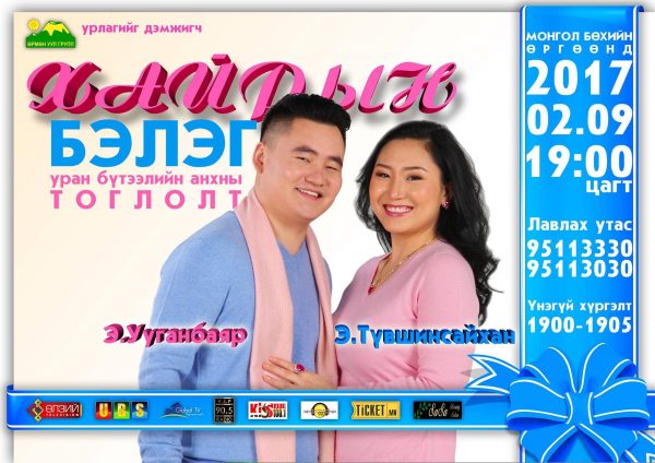 Эрхэм та дуучин Э.Ууганбаяр, Э.Түвшинсайхан нарын уран бүтээлийн хуримын гэрч болж, “ХАЙРЫН БЭЛЭГ” тоглолтонд морилон саатах бол 95113330, 95113030, 19001905 дугаарт хандаж урилгаа аваарай…