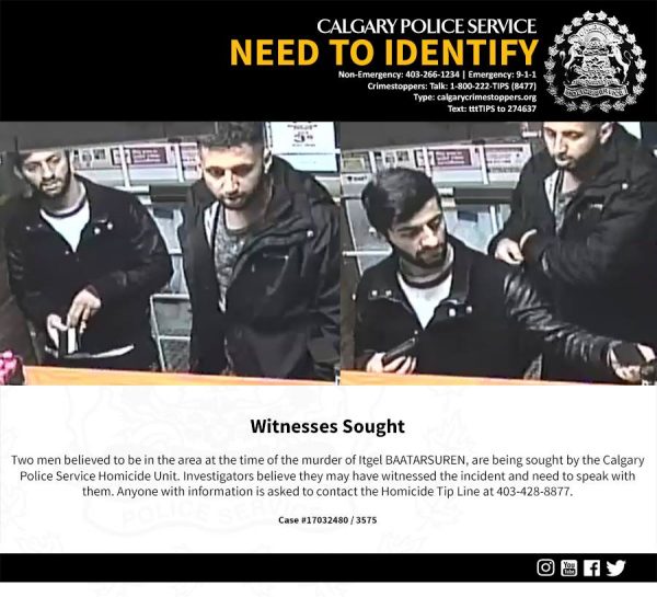 Канадын хэвлэл мэдээллийн хэрэгслүүд тус улсын Калгари хотод толгойдоо буудуулан нас барсан нэгэн эрэгтэйн хэргийн талаар мэдээлж байна. Амиа алдсан тэрхүү эрэгтэйг 22 настай И.Баатарсүрэн /Itgel BAATARSUREN/ хэмээх Монгол залуу болохыг албаныхан тогтоогоод байгаа аж. Калгари хот нь Канадын Алберта мужид оршдог бөгөөд монголчууд цөөнгүй байдаг газар аж. Тэгвэл цагдаа нарын хэлж буйгаар, орон нутгийн цагаар өнгөрөгч даваа гаригийн орой 22 настай Монгол залууг цагаан өнгийн “Pontiac G5” маркийн автомашин эмнэлгийн гадаа орхиод зугтсан байна. Хэдийгээр Монгол залууд эмнэлгийн тусламж үзүүлсэн ч толгойдоо авсан сумны шархны улмаас нас барсан аж. Энэ хэрэгтэй холбогдуулан цагдаа нар цагаан өнгийн “Pontiac G5” маркийн автомашиныг хайж байгаа ба Монгол залуугийн үхэлд зурагт үзүүлсэн хоёр эрэгтэйг сэжиглэн эрэн сурвалжилж эхэлжээ.
