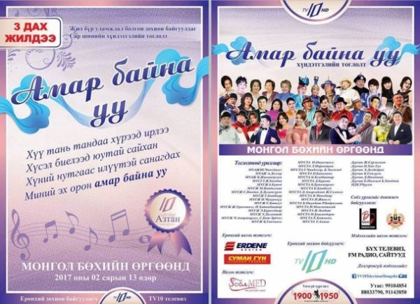 “ТВ-10” телевиз 5-н жилийнхээ ойг тохиолдуулан Монолын үндэсний баяр цагаан сарыг угтан урлаг соёлын гавьяатууд, дуучидтай хамтарч уран бүтээлийн “Амар байна уу?” хүндэтгэлийн тоглолтыг зохион байгуулдаг уламжлалтай билээ. Энэ удаагийн тоглолт хоёрдугаар сарын 13-ны өдөр Монгол бөхийн өргөөнд 19:00 цагт болохоор товложээ. Тоглолтод дуурь, эстрад, нийтийн дуучид оролцон ая дуугаа өргөх юм байна.
