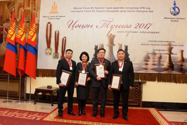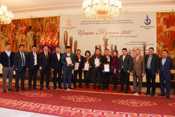 Шагналыг УИХ дахь шатрын спортыг дэмжих лобби бүлгийн ахлагч, УИХ-ын гишүүн Л.Оюун-Эрдэнэ, УИХ-ын Тамгын газрын Хууль, эрх зүйн асуудал хариуцсан нарийн бичгийн дарга Д.Амгалан, УИХ-ын Тамгын газрын Захиргаа, аж ахуйн асуудал хариуцсан нарийн бичгийн дарга П.Цэрэн, Монголын шатрын холбооны гүйцэтгэх захирал Б.Наранбаатар нар гардуулж өгөв.