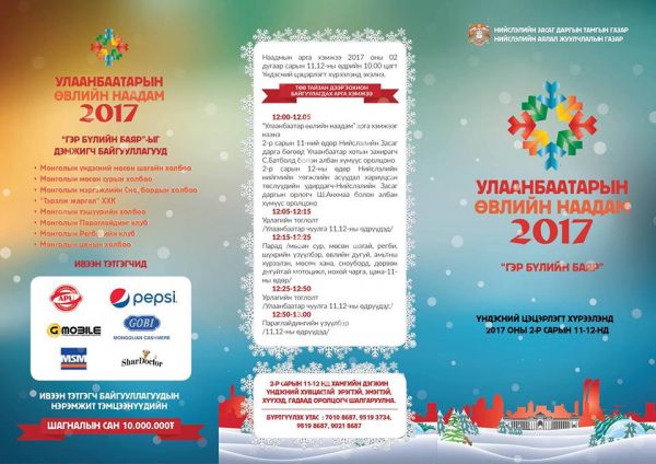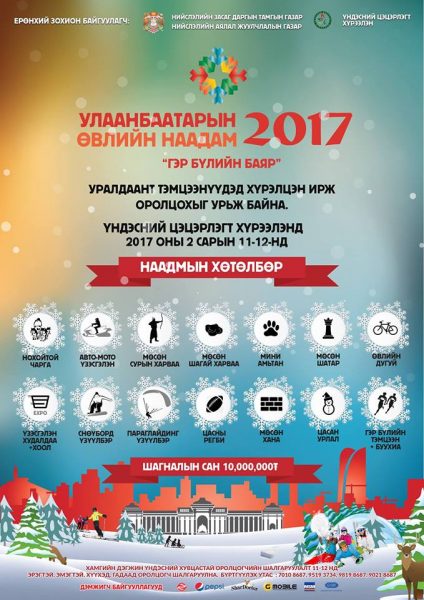 Нийслэлийн Засаг даргын Тамгын газар, нийслэлийн Аялал жуулчлалын газраас “Улаанбаатарын өвлийн наадам-2017” гэр бүлийн баярыг энэ сарын 11, 12-ны өдөр Үндэсний цэцэрлэгт хүрээлэнд зохион байгуулах гэж байна. Өвлийн спортын төрлийг хослуулсан тус наадмын хүрээнд мөсөн шагайн харваа, мөсөн сурын харваа, мөсөн хананы авиралт, уран гулгалт, шүхрийн үзүүлбэр, мөсөн шатар, өвлийн дугуй, 4 дугуйт мотоциклийн парад зэрэг арга хэмжээ зохион байгуулахаар төлөвлөжээ.