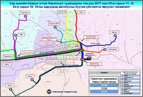 Автозамын хөдөлгөөний ачааллыг бууруулах зорилгоор дугаарын хязгаарлалт хийгдэх өдрүүд буюу Бямба, Ням гарагт “Нарантуул” худалдааны төв рүү их багтаамжийн буухиа автобус 10:00,12:30,15:00 цагт иргэдэд үйлчилнэ.