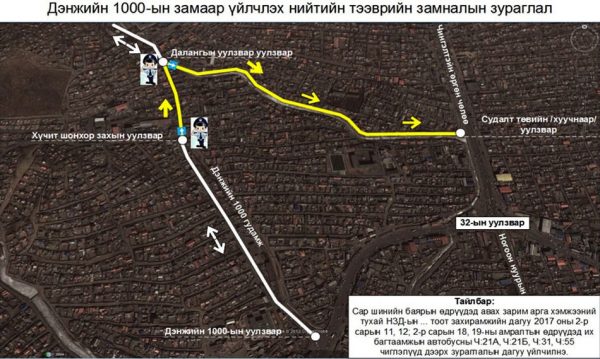 Мөн “Дэнжийн 1000”-ын автозамын хөдөлгөөнийг нэг чигийн хөдөлгөөнд оруулах арга хэмжээг авч байгаатай холбогдуулан “Дэнжийн 1000” чиглэлд хүрч үйлчилдэг нийтийн тээврийн 4 чиглэлийн хөдөлгөөнийг нэг чигт оруулан явуулах зохицуулалтыг хийх юм байна.