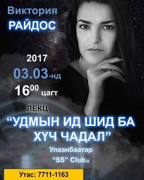 ОХУ-ын алдарт зөн билэгч, “Зөн билгийн тулаан” реалити шоуны 16 дахь улирлын ялагч “Оросын хар шулам” гэгддэг хар домын шидтэн, зөн билэгч Виктория Райдос гуравдугаар сарын 3-нд Монгол улсад дахин айлчлах гэж байна. Тэрбээр өмнө нь 2016 оны зургадугаар сард анх удаа манай улсад ирж байсан бөгөөд энэ удаад түүнийг хүлээсэн ард олны хүлээлт, итгэл асар их байгаа юм. Оросын зөн билэгчдийн ялагчид дотроос хамгийн хүчтэйд тооцогддог түүний лекц гуравдугаар сарын 3-нд “SS club”-т 16:00 цагаас болох бөгөөд (500 хүний хязгаартай) түүний дараа ердөө 2 хоногийн хугацаанд Монголд байрлах тул та бүхэн билетийн талаар болон бусад лавлах зүйлсээ 99205231, 99207624, 77111163 дугаарын утсаар асууна уу.