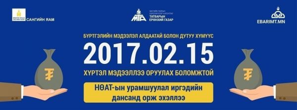Цахим төлбөрийн баримтын нэгдсэн систем “e-barimt.mn”-д 620,409 албан татвар төлөгч бүртгүүлсэн байна. Үүнээс хуульд заасан албан татвар буцаан олгох нөхцөл, шаардлага хангасан482,600 татвар төлөгч иргэний 2016 онд албан татвар суутган төлөгчтэй хийсэн худалдан авалтад төлсөн 34.5 тэр бум төгрөгийг буцаан олгох гүйлгээ хийгдэж байна.