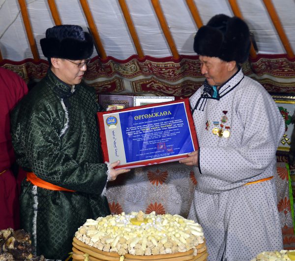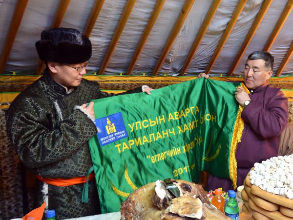 Мөн “Улсын аварга тариаланч хамт олон”-оор шалгарсан Дархан-Уул аймгийн Хонгор сумын “Өглөгчийн хэрэм” ХХК, Сэлэнгэ аймгийн Ерөө сумын “Их шинэстэй” ХХК болон улсын аварга тариаланчаар тодорсон Дархан-Уул аймгийн Хонгор сумын аварга тариаланч Б.Жаргалсайхан нарт Засгийн газрын шагналыг гардуулан өглөө. Аваргын болзол хангасан малчид, иргэд, тариаланчид, хамт олонд цом, тэмдэг, үнэмлэх, өргөмжлөл, улаан халз бүхий 5 ханатай гэр бэлэглэж байна.