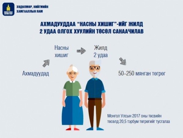 Тэгвэл бүртгүүлсэн ахмадуудын хувьд энэ сарын 20-оос эхлэн “Хаан”, “Төрийн банк”, “Капитал” банкуудаар авч болох юм байна. Харин Үндэсний их баяр наадмаар олгох насны хишгийг ирэх зургадугаар сарын 25-наас эхлэн олгохоор Хөдөлмөр халамж үйлчилгээний газраас төлөвлөөд байна. Дашрамд дурдахад, Насны хишиг олгох зардалд 20.5 тэрбум төгрөг тусгасан байна.