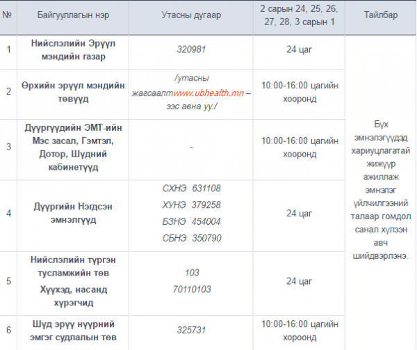 Монголын уламжлалт Цагаан сарын баяртай холбогдуулан амралтын өдрүүдэд эмнэлэг үйлчилгээг хэрхэн зохицуулах тухай Нийслэлийн Эрүүл Мэндийн Газрын даргын тушаал гарчээ. Тушаалд заасны дагуу ажиллах эрүүл мэндийн байгууллагуудын цагийн хуваарийг хүргэж байна.