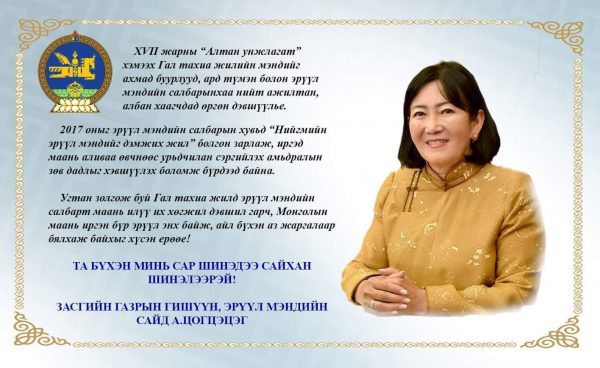 XVII жарны “Алтан унжлагат” хэмээх Гал тахиа жилийн мэндийг ахмад буурлууд, ард түмэн болон эрүүл мэндийн салбарынхаа нийт ажилтан, албан хаагчдад өргөн дэвшүүлье.