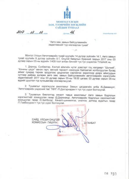 Зам тээврийн хөгжлийн сайдын 2017 оны 03 дугаар сарын 03-ны өдрийн 46 тоот тушаалаар Улаанбаатар, Хэнтий, Сүхбаатар,  Дорнод аймгуудын чиглэлд тээврийн хэрэгслийн хөдөлгөөнийг хязгаарлалаа. Хязгаарлалт  03 дугаар сарын 03-ны өдрийн 18:00 цагаас 03 дугаар сарын 05-ны өдрийг дуустал үргэлжлэх юм.