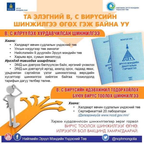 В,С вирусын хурдавчилсан шинжилгээнд хамрагдахын тулд харьяа өрх, сумын эмнэлгүүд болоод Нийслэлийн есөн дүүргийн Эрүүл мэндийн төв, Улсын нэгдүгээр төв эмнэлэг, Халдварт өвчин судлалын үндэсний төвд хандах боломжтой.Шинжилгээнд хамрагдахдаа ЭМД-ийн дэвтэр, иргэний үнэмлэхтэй ирэх бөгөөд даатгалын дэвтэргүй тохиолдолд тарифын дагуу төлбөр төлөх аж.