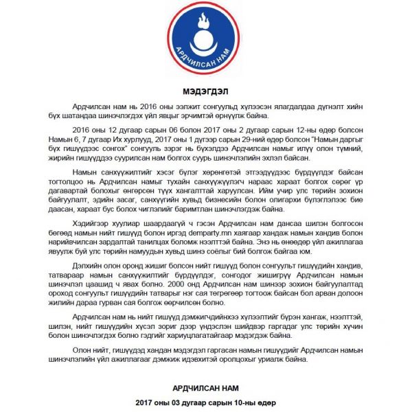 АРДЧИЛСАН НАМЫН МЭДЭГДЭЛ