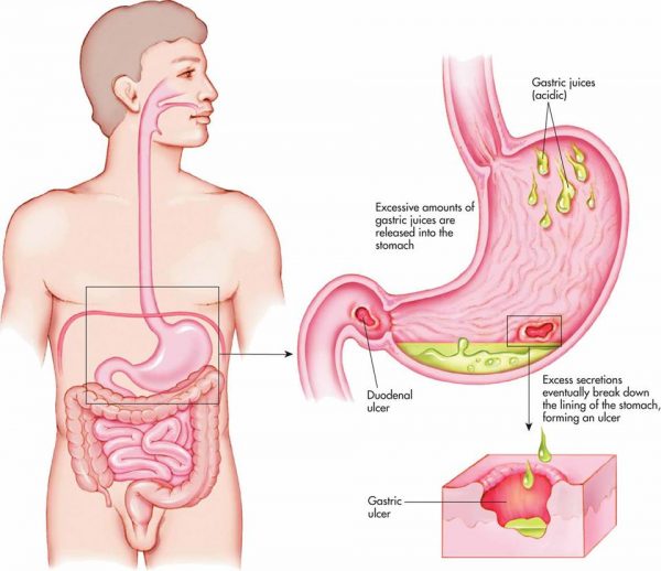 Өвчтөнд цээж гашуу оргих,хүчиллэг зүйлээр гулгих, дотор муухай оргих, идсэн зүйл болон бор хүрэн зүйлээр бөөлжих, өтгөн хар гарах, гэдэсний хямралын шинж тэмдэг тод илэрнэ.