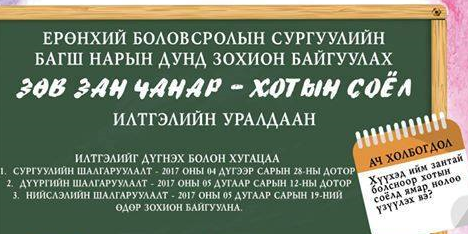Нийслэлийн Соёл, урлагийн газар болон Боловсролын газар, “Өөрчлөлтийг шинэчлэгч төв” ТББ хамтран нийслэлийн ерөнхий боловсролын сургуулийн багш нарын дунд “Зөв зан чанар–Хотын соёл” илтгэлийн уралдаан зарлаж байна. Удирдамжид заагдсан зан чанарууд болон багш нар өөрсдийн шинэ санал, санаачлагыг гаргаж, илтгэлээ боловсруулна. Илтгэлийг 3 үе шаттай зохион байгуулах бөгөөд шалгаруулалтыг ирэх дөрөвдүгээр сарын 18-наас тавдугаар сарын 19-ний өдөр хүртэл зохион байгуулах юм.