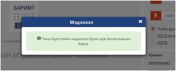 НЭГ. Таны мэдээлэл бүрэн баталгаажсан бол цахим хуудасруу нэвтрэн ороход доорх “Мэдээлэл” сануулга гарч ирнэ. Энэ тохиолдолд таны мэдээлэл үнэн зөв баталгаажсан бөгөөд урамшуулал авахад бэлтгэл хангагдсан гэж ойлгоно.