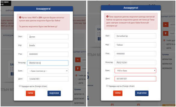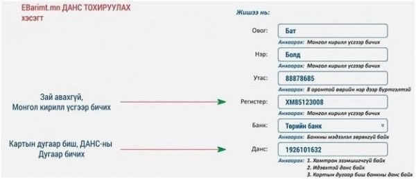 ГУРАВ. Та мэдээллээ үнэн зөв оруулахын тулд EBARIMT.MN – ХУВЬ ХҮН – НЭВТРЭХ – ДАНС – ТОХИРУУЛАХ дарааллаар орж, доорх байдлаар мэдээллээ үнэн зөв болгоно уу. Хэрэв та код, нууц үгээ мартсан бол ХУВЬ ХҮН – НЭВТРЭХ – “Бүртгэлээ сэргээх бол ЭНД дарна уу!” дарааллаар орж өөрийн бүртгүүлсэн мэйлээр нууц үгээ авах боломжтой. Жишээ загвар: