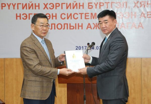 Танилцуулга хийсний дараа Хууль зүй, дотоод хэргийн сайд С.Бямбацогт “Эрүүгийн хэргийн бүртгэл, хяналтын нэгдсэн систем”-ийг холбогдох бичиг баримт, гарын авлагын хамт Шүүхийн ерөнхий зөвлөлийн дарга Н.Лүндэндоржид хүлээлгэн өглөө.