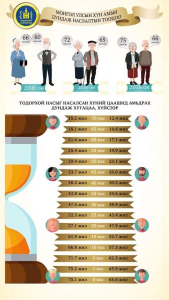 Монгол Улсын шинэ төрсөн эрэгтэй хүүхэд цаашид 65.6 жил, эмэгтэй хүүхэд 75.1 жил амьдарна гэсэн тооцоо гарсан байна.