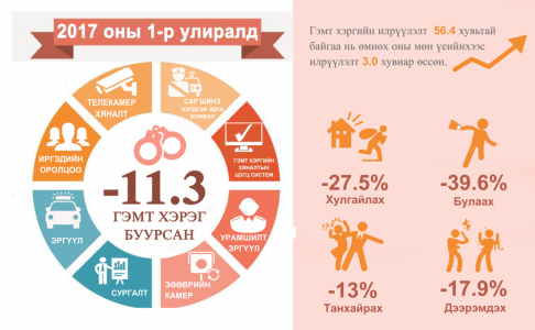 Эдгээр ажлууд нь үр дүнгээ өгч нийслэлийн хэмжээнд 2017 оны 1 дүгээр улиралд 4353 гэмт хэрэг бүртгэгдсэн нь өмнөх оны мөн үеийнхээс 556 хэргээр буюу -11.3 хувиар буурсан. Улсын хэмжээнд бүртгэгдсэн нийт гэмт хэргийн 63.4 хувь нь Улаанбаатар хотод үйлдэгдсэн байна.