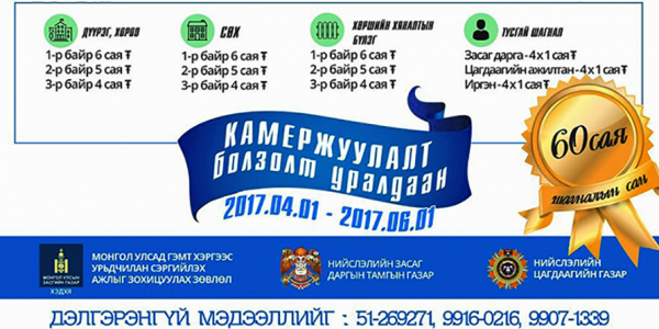 Нийслэл хотод үйлдэгдэж буй гэмт хэргийг бууруулах, урьдчилан сэргийлэх ажлын хүрээнд орон сууц түүний гадна орчин, гэр хорооллын гудамж, талбайг камержуулж иргэдийн эрүүл, аюулгүй орчинд амьдрах нөхцөл бололцоог бүрдүүлэх, гэмт хэргээс урьдчилан сэргийлэх ажилд иргэд, олон нийтийн оролцоог нэмэгдүүлэх зорилгоор нийслэлийн Цагдаагийн газраас санаачлан Монгол Улсад Гэмт хэргээс урьдчилан сэргийлэх ажлыг зохицуулах зөвлөл, нийслэлийн Засаг даргын тамгын газар, нийслэлийн Гэмт хэргээс урьдчилан сэргийлэх ажлыг зохицуулах зөвлөлтэй хамтран 60.000.000 төгрөгийн шагналын сантай “Камержуулалт” болзолт уралдааныг зарлалаа. Уралдаан ирэх зургаадугаар сарын 1-ний өдрийг хүртэл 2 сарын хугацаатай болох юм.