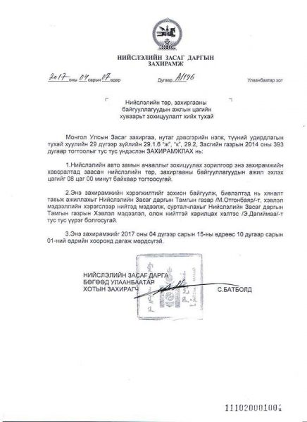 Нийслэлийн удирдах ажилтны ээлжит шуурхай зөвлөгөөн  энэ сарын 10-ны өдөр болж өнгөрсөн.  Тус  зөвлөгөөнөөр  Нийслэлийн Засаг дарга бөгөөд Улаанбаатар хотын Захирагч С.Батболд  захирамж гаргаж  Нийслэлийн авто замын ачааллыг зохицуулах, түгжрэлийг бууруулах зорилгоор нийслэлийн төр, захиргааны байгууллагуудын ажлын цагийн хуваарьт өөрчлөлт оруулж ажил эхлэх цагийг  08.00 цаг байхаар тогтоож, захирамж гаргасан юм. Энэхүү захирамж  нь   2017 оны дөрөвдүгээр сарын 15-ны өдрөөс аравдугаар сарын 1-ний өдөр хүртэл хугацаанд хэрэгжих юм.  4-р сарын 15-ны өдөр амралтын өдөр таарч байгаа учир ирэх даваа гариг буюу энэ сарын 17-ны өдрөөс  хэрэгжиж эхэлнэ.