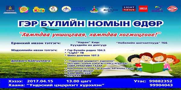 “Дэлхийн гэр бүлийн номын өдөр”-ийн хүрээнд “Хүүхдийг номтой нөхөрлөхөд ээжүүдийн оролцоо” сэдэвт өдөрлөг Үндэсний цэцэрлэгт хүрээлэнд зохион байгуулагдаж байна. Тус өдөрлөгийн үер хүүхдүүдэд бага насанд нь номтой зөв харьцах, номын сайн найз болох, ном уншихын ач холбогдлыг ойлгуулах, зөв дадал хэвшил олгох сургалт, зөвлөмжүүд, хүүхдийн номын худалдаа, вагон аялал, төрөл бүрийн тэмцээн уралдаанууд, урлагийн тоглолт, гэр бүлд чиглэсэн мэдээ мэдээллүүд зэрэг олон төрлийн үйл ажиллагаа явагдаж байна. Энэхүү өдөрлөгийг Засгийн газрын хэрэгжүүлэгч агентлаг соёл урлагийн газар, Нийслэлийн Хүүхэд гэр бүлийн хөгжлийн газар, Гэр бүлийн радио 104,5, Нобелийн шагналтнууд ТББ, Үндэсний цэцэрлэгт хүрээлэн, “Наран” Кидс хүүхдийн их дэлгүүр, АПУ ХХК, Чингэлтэй дүүрэг, Хаан милк ХХК зэрэг 9-н байгууллагын төлөөлөл хамтран зохион байгуулж байгаа юм. Ном уншсанаар бид хэрэгцээт мэдээллээ олж авах, зөв бичдэг болох, үндэснийхээ оюуны өвийн талаар зохих мэдлэгийг олж аван эх оронч сэтгэлгээтэй болох Монгол хүний удам судар, зан заншил, бага насны хүүхдийн оюун ухаан, ой тогтоолт сайжрах зэрэг олон талын ач холбогдолтой юм. Амралтын өдрийг гэр бүлдээ зориулж та бүхэн номын өдөрт хүрэлцэн ирээрэй.