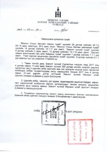 Сайдын зөвлөлийн хуралдаанаас Тавантолгой дахь Зэвсэгт хүчний сургалтын нэгдсэн төвд 350 дугаар ангийн хээрийн дадлага сургалтын үеэр хоёр цэргийн алба хаагч амь үрэгдсэн ноцтой хэрэгт шууд хамаарал бүхий ажил хариуцсан албан тушаалтнуудад холбогдох хуулийн дагуу хатуу хариуцлага тооцож гурав хоногийн дотор буюу 2017 оны 4 дүгээр сарын 21-ний дотор илтгэхийг Зэвсэгт хүчний Жанжин штаб /дэслэгч генерал Д.Даваа/- д үүрэг болголоо.